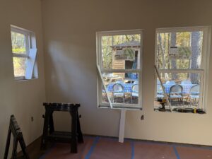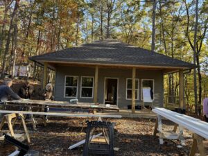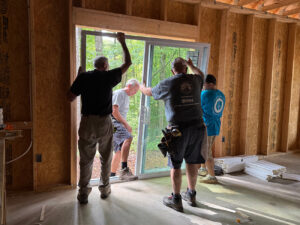 We experienced several rain delays in the starting of our latest home build, but when the sun came out, we were off to a fantastic start! Averaging 20 volunteers on each Saturday, this team of volunteers has exceeded all expectations. On the first day, all exterior framing was completed & walls were raised, which led right into the interior walls being constructed and raised on Day 2. Our third volunteer day all exterior sheathing was completed and the house truly took shape. The front door was cut out and the feeling of home started setting in. The fourth day was full of excitement as the windows were opened and prepped and the front porch beams were set. This was all accomplished during the month of June! We’re now ready to let the professionals do their thing and set the trusses and prep the roof. We may be taking a short break from volunteer build days, but we’ll be back building soon!
